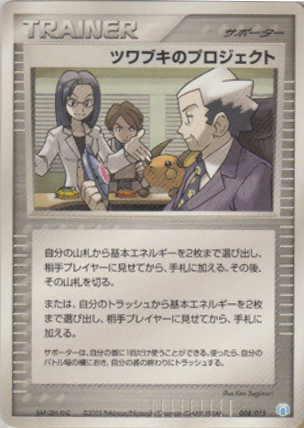 自分の山札から基本エネルギーを2枚まで選び出し、相手プレイヤーに見せてから、手札に加える。その後、その山札を切る。または、自分のトラッシュから基本エネルギーを2枚まで選び出し、相手プレイヤーに見せてから、手札に加える。