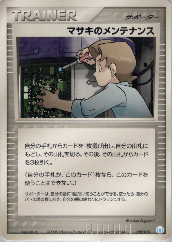 自分の手札からカードを1枚選び出し、自分の山札にもどし、その山札を切る。その後、その山札からカードを3枚引く。(自分の手札が、このカード1枚なら、このカードを使うことはできない。)