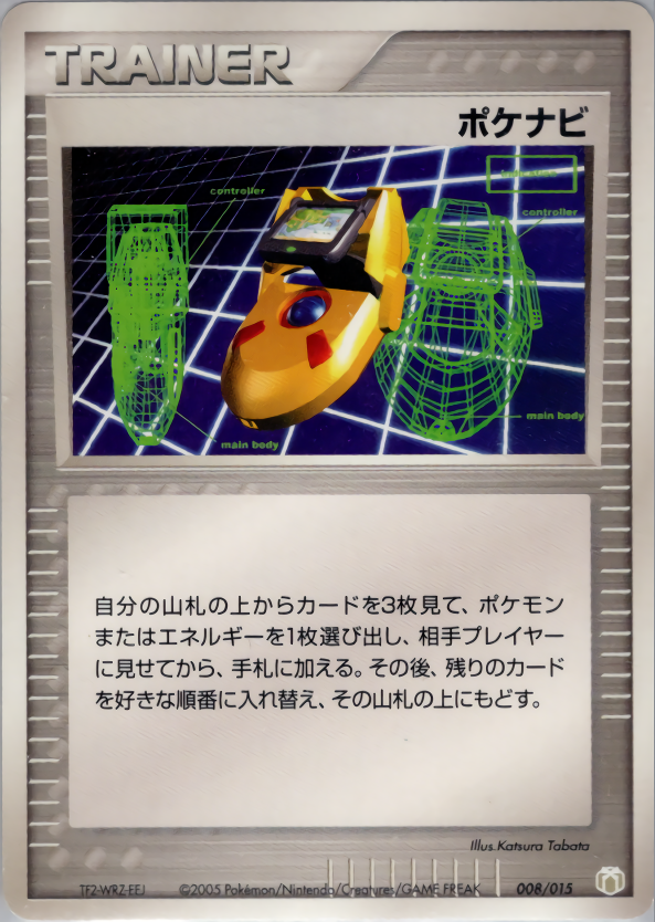 自分の山札の上からカードを3枚見て、ポケモンまたはエネルギーを1枚選び出し、相手プレイヤーに見せてから、手札に加える。その後、残りのカードを好きな順番に入れ替え、その山札の上にもどす。