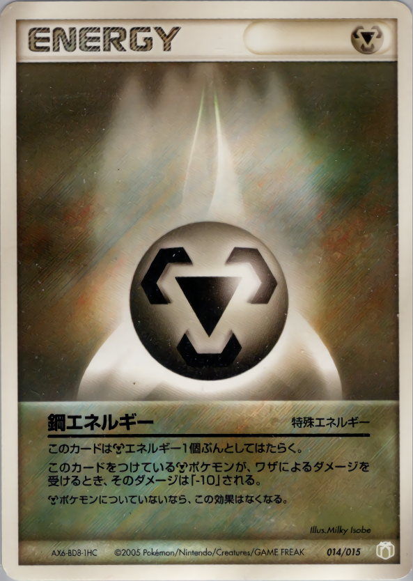 このカードは鋼エネルギー1個ぶんとしてはたらく。このカードをつけている鋼ポケモンが、ワザによるダメージを受けるとき、そのダメージは「-10」される。