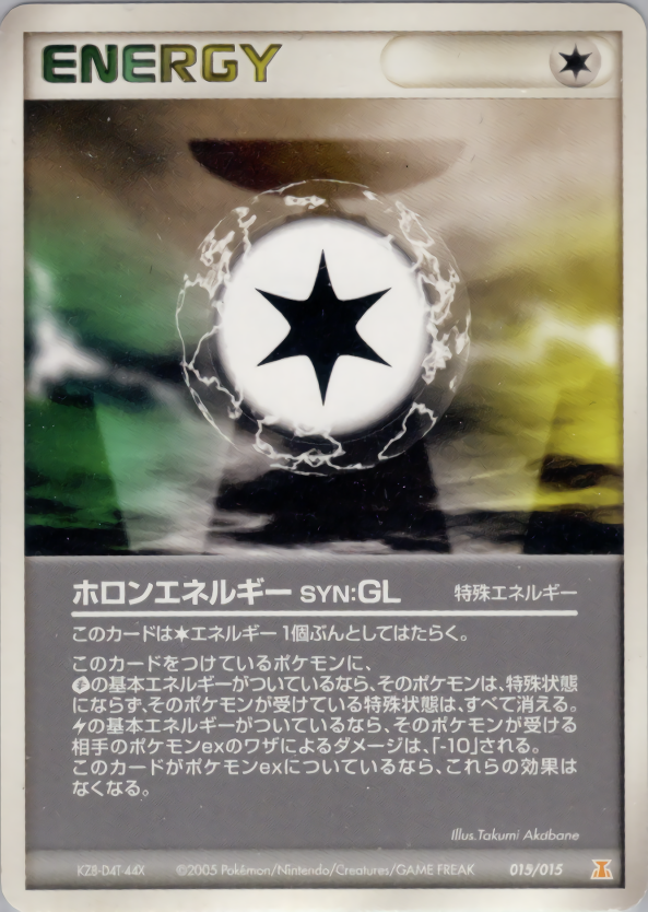 このカードは無エネルギー1個ぶんとしてはたらく。このカードをつけているポケモンに、草の基本エネルギーがついているなら、そのポケモンは、特殊状態にならず、そのポケモンが受けている特殊状態は、すべて消える。雷の基本エネルギーがついているなら、そのポケモンが受ける相手のポケモンexのワザによるダメージは、「-10」される。このカードがポケモンexについているなら、これらの効果はなくなる。