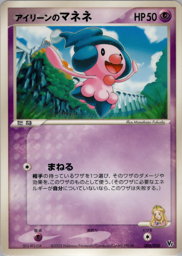 相手の持っているワザを1つ選び、そのワザのダメージや効果を、このワザのものとして使う。(そのワザに必要なエネルギーが自分についていないなら、このワザは失敗する。)