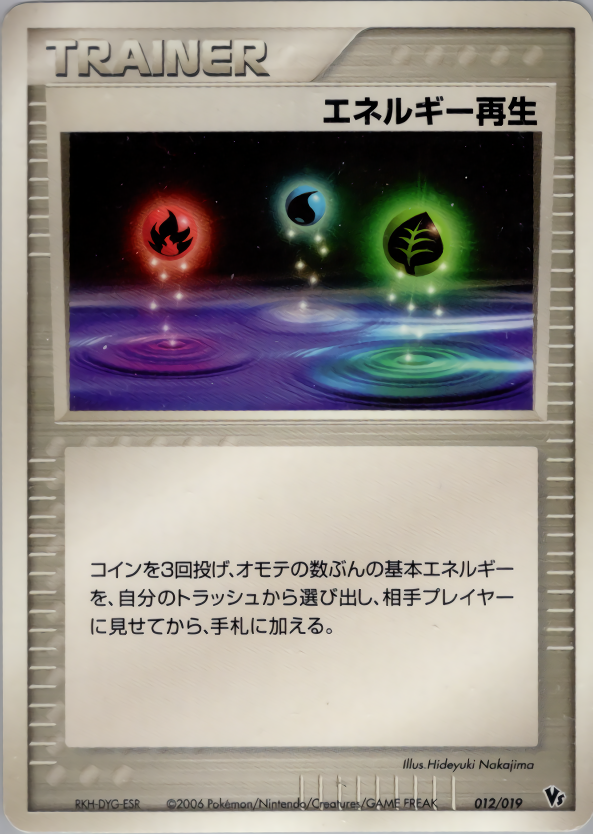 コインを3回投げ、オモテの数ぶんの基本エネルギーを、自分のトラッシュから選び出し、相手プレイヤーに見せてから、手札に加える。