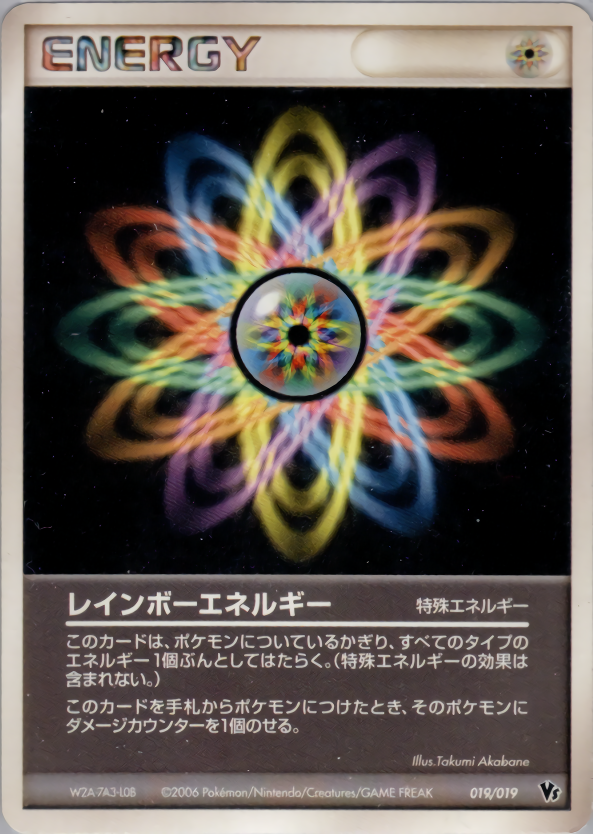 このカードは、ポケモンについているかぎり、すべてのタイプのエネルギー1個ぶんとしてはたらく。(特殊エネルギーの効果は、含まれない。)このカードを手札からポケモンにつけたとき、そのポケモンにダメージカウンターを1個のせる。