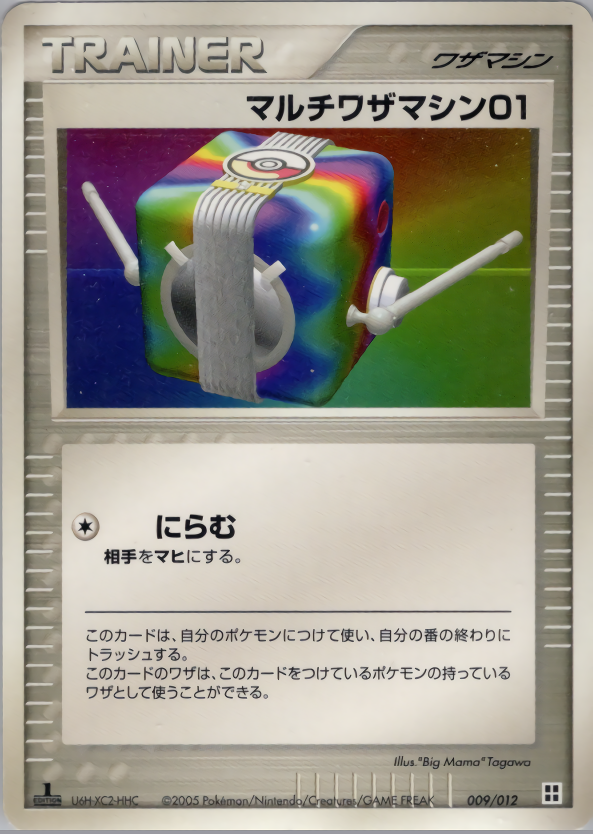 このカードは、自分のポケモンにつけて使い、自分の番の終わりに トラッシュする。 このカードのワザは、このカードをつけているポケモンの持っている ワザとして使うことができる。
