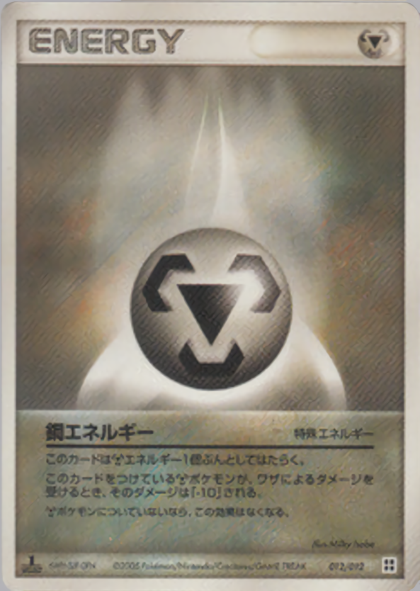 このカードは鋼エネルギー1個ぶんとしてはたらく。このカードをつけている鋼ポケモンが、ワザによるダメージを受けるとき、そのダメージは「-10」される。