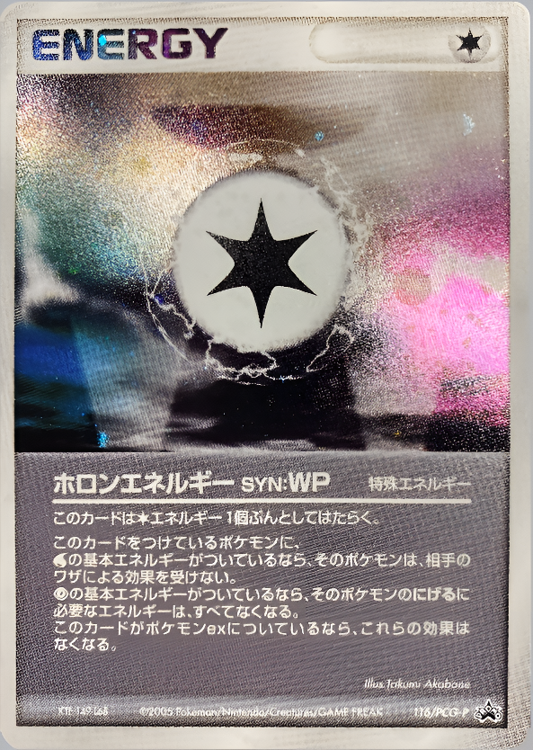 このカードは無エネルギー1個ぶんとしてはたらく。このカードをつけているポケモンに、水の基本エネルギーがついているなら、そのポケモンは、相手のワザによる効果を受けない。超の基本エネルギーがついているなら、そのポケモンのにげるに必要なエネルギーは、すべてなくなる。このカードがポケモンexについているなら、これらの効果は、なくなる。