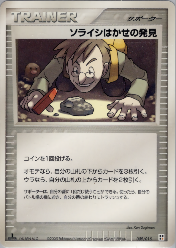 オモテなら、自分の山札の下からカードを3枚引く。ウラなら、自分の山札の上からカードを2枚引く。