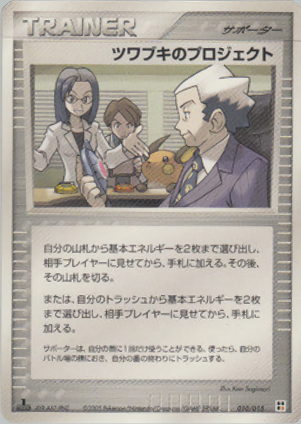 自分の山札から基本エネルギーを2枚まで選び出し、相手プレイヤーに見せてから、手札に加える。その後、その山札を切る。または、自分のトラッシュから基本エネルギーを2枚まで選び出し、相手プレイヤーに見せてから、手札に加える。
