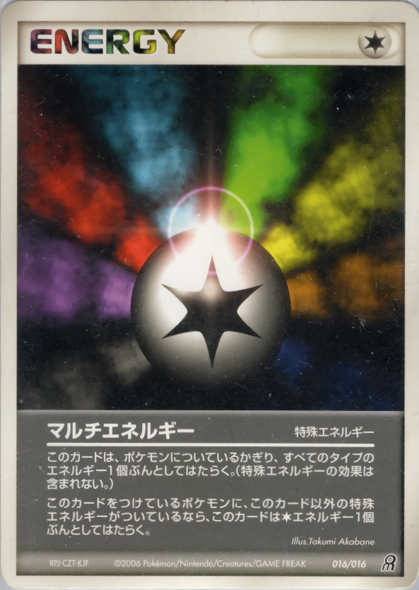 このカードは、ポケモンについているかぎり、すべてのタイプのエネルギー1個ぶんとしてはたらく。(特殊エネルギーの効果は、含まれない。)