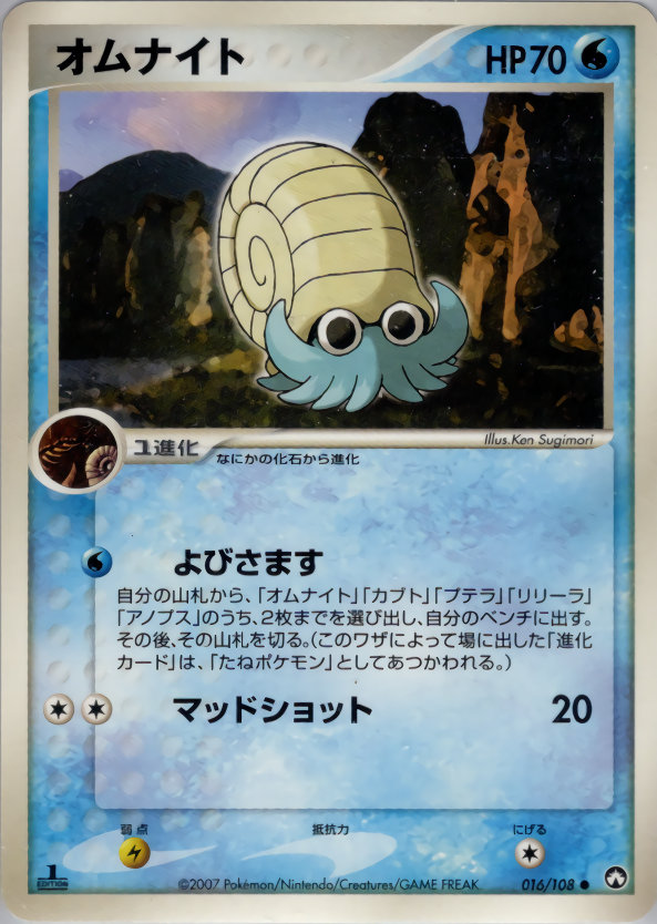 自分の山札から、「オムナイト」「カブト」「プテラ」「リリーラ」「アノプス」のうち、2枚までを選び出し、自分のベンチに出す。その後、その山札を切る。(このワザによって場に出した「進化カード」は、「たねポケモン」としてあつかわれる。)