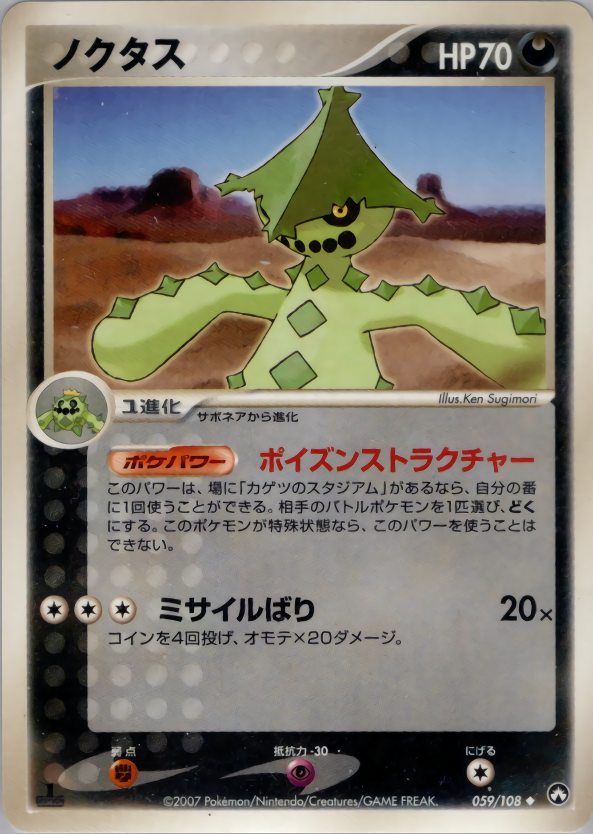 このパワーは、場に「カゲツのスタジアム」があるなら、自分の番に1回使うことができる。相手のバトルポケモンを1匹選び、どくにする。このポケモンが特殊状態なら、このパワーを使うことはできない。