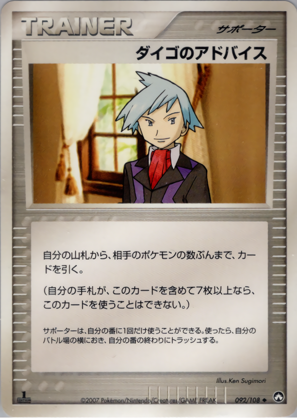 自分の山札から、相手のポケモンの数ぶんまで、カードを引く。(自分の手札が、このカードを含めて7枚以上なら、このカードを使うことはできない。)