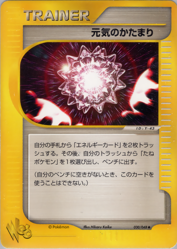 自分の手札から「エネルギーカード」を2枚トラッシュする。その後、自分のトラッシュから「たねポケモン」を1枚選び出し、ベンチに出す。(自分のベンチに空きがないとき、このカードを使うことはできない。)
